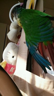 ケロちゃんは飛べるのに、いまのところ逃げたりしないでケージにも素直に入ってくれるので助かります(^-^)