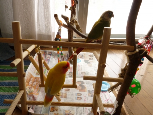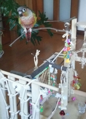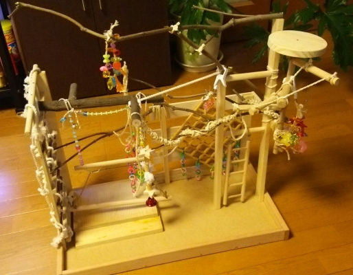 ご主人様ログハウス兼アスレチックを上手く作られていますね、止まり木も沢山作られているのですね(^-^)