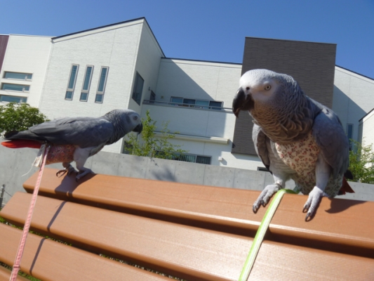 我が家では日光浴する場所がないのでお散歩は必須なのですが、ヨウムって結構びっくりして飛ぶのでリードは絶対です。
