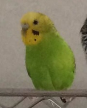 トメ♀セキセイインコ、頭:黄色、身体:黄緑。両頬にブルーの模様あり。