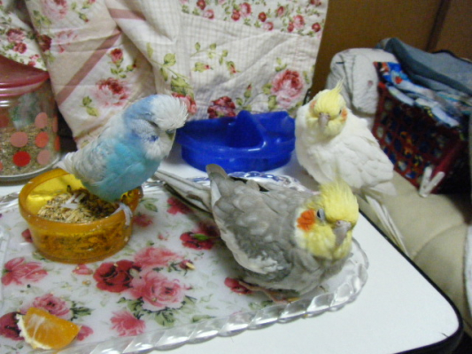 オカメのレモンとコザクラの柚子♪ ルナ。親バカですが、中々のイケメン♪ 男3羽でごはん中♪