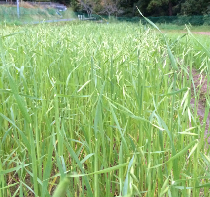 台風が去り、おそるおそる畑へ行くと、シャキーンとしたままのエン麦が目に入りほっとしました。