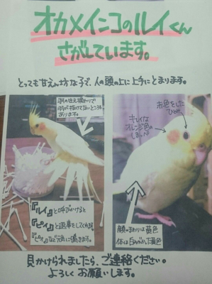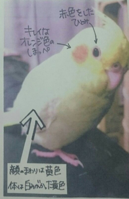 【大阪府東大阪市】黄色いオカメインコ(ルチノー)のルイくん探してます