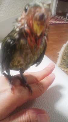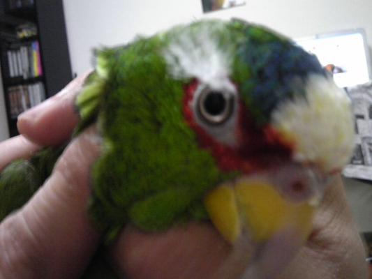 お目めの綿毛も痛そうですが、抜けかけた羽根、しかも羽衣セキセイのように生えている方向と逆なやつ。