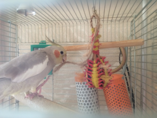 工夫なんてないのですが、荷造り用の麻ヒモがいいおもちゃになっています。ケージの屋根からぶら下げているだけです。