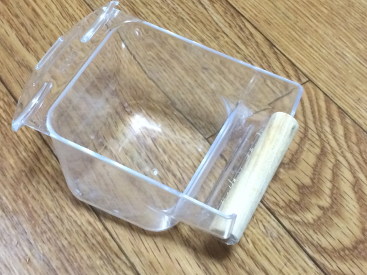 HOEIの35用えさ入れには止まり木はなく、鳥の足では滑りやすいんですね。うちの子は床から餌入れに上がろうとして足を引っ掛けようとしても、何度か滑って失敗していました。
