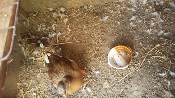 黒ちゃん、藁と白ちゃんの換羽の羽で巣作り。