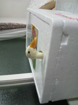 この発泡スチロールは雛の時期に小屋として使っていました。