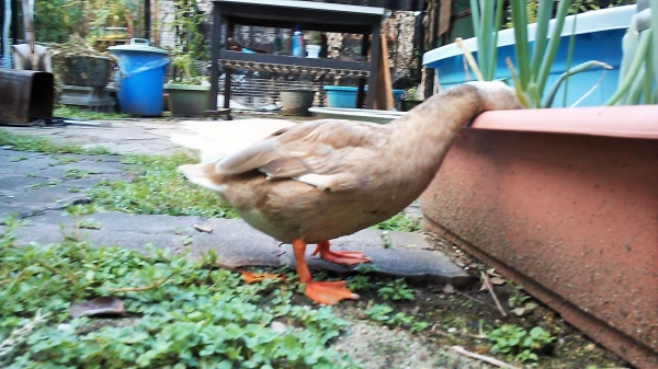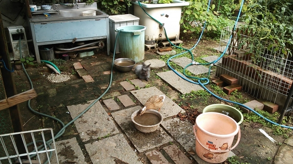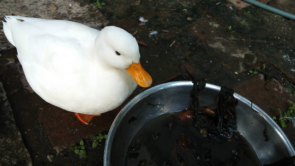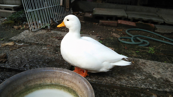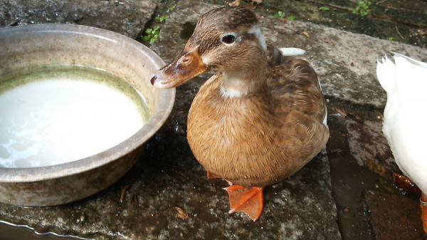 アヒルはよく水を飲むのでいつでも飲めるように洗面器に水を張って置いています。