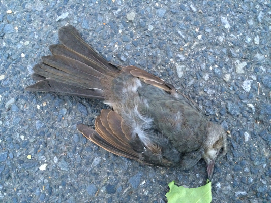 続く8月7日の朝、自動車の行き交う道路上に幼鳥がいることに気づきました。なぜかうまく飛び上がれず、ただ鳴いてばかりいました。「このままでは轢かれてしまう」と思い、救い出すことにしたのですが、自動車が途切れるタイミングを見計らおうと迷っているうちに轢かれてしまいました。赤い鮮血がアスファルト上に飛び散りました。
