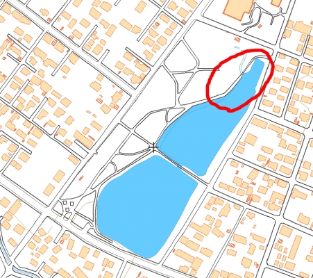 公園の貯水池は小さい橋を挟んで北側と南側に分かれていますが、アヒル達は主に北側の貯水池で見かけます。特にその北側貯水池の北部の草むら付近でよく見かけます。陸に上がっているのは大抵は北西の岸付近です。ただし、水面では北側の貯水池全般を行き来しているようで、今日の夕方も北側貯水池の南東の端にで浮かんでいました。