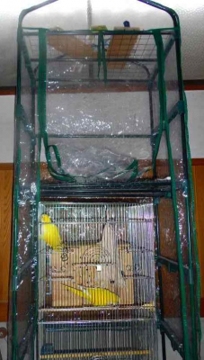 この黄色いインコは夜はかごの上から布製の保温カバーを掛けるのみで冬をすごします。