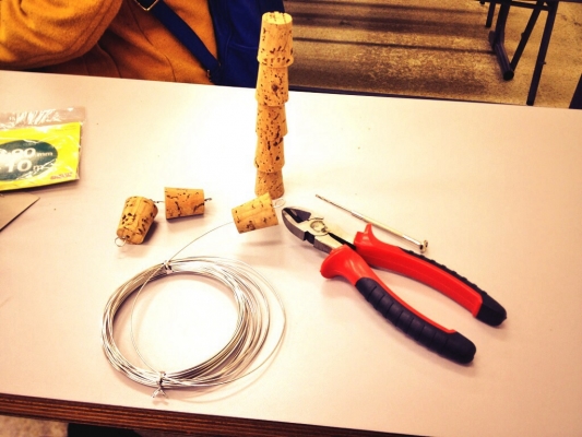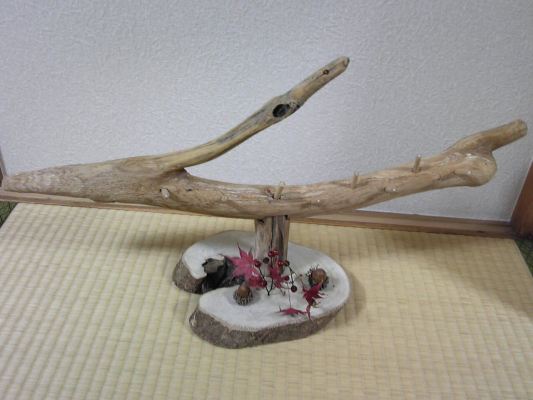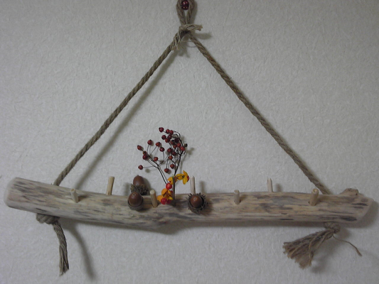 流木の枝に直径5ミリ程の穴を開け、そこに細い木の棒を挿し、