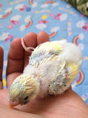 Male Double Factor Dominant Piedの写真を見ると、生後2、3週間の子のロウ膜の色とカイラさんのインコの孵化後17日の写真でのロウ膜の色が大体同じようですので、