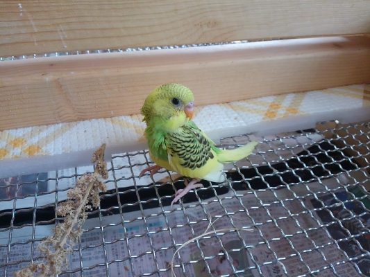 最初の子は、金網をよじ登って、止まり木に行けますが