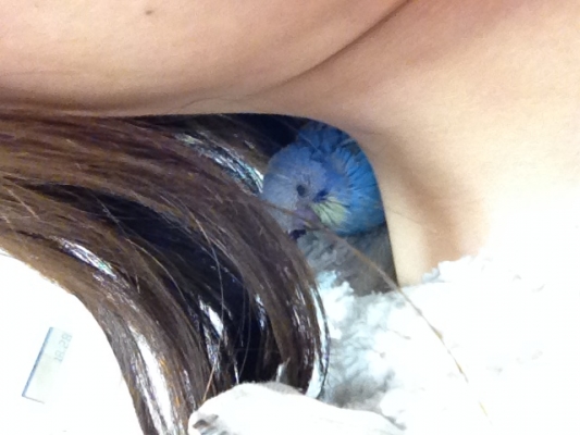 一旦 肩に止まるとずっとそこで過ごしてしまいます。