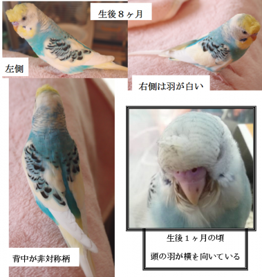 背中の羽の模様が非対称で、なおかつ、頬のチークパッチの羽の色も非対称です。チークパッチは健康状態によって変化すると何処かしらネットで見かけたことがあるので心配です。
