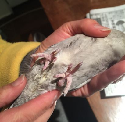 オカメインコ幼鳥の爪が紫です。