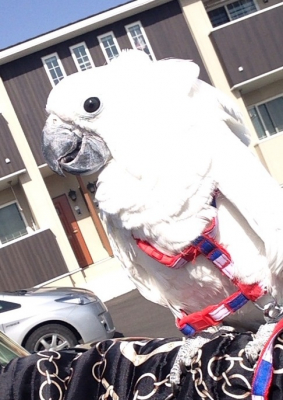 白いから赤と青のハーネスが似合いますね(≧∇≦)
