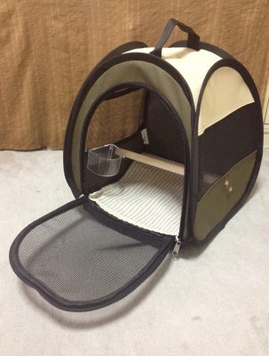 すぐに連れ出せる様にと敢えてカバーを掛けたままにしてケージのそばに置いてあるキャリーと、このキャリーも一緒に入れる事が出来る大きなバッグに下記の物を入れてあります。