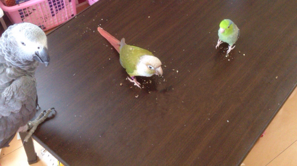 蘭(ヨウム)はチビたちと仲良いですよ(^^)