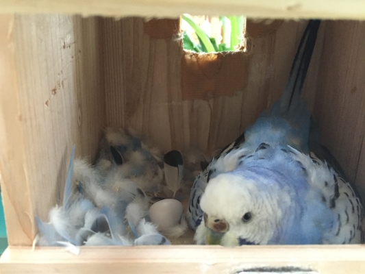 ようやく4個目の卵を巣箱内で産卵しその後も計7個の卵を産み、巣箱内で産んだ4個のみ抱卵しています。産んだ卵が有精卵か無精卵かは確認していません。♀はほぼ終日巣箱内で卵を抱えおり、たまに巣箱外に出て来て♂から口移しでエサを食べさせてもらったり毛繕いをしてもらったりしておりますがここ最近♀の抜け毛が多くなってきて巣箱の中に羽毛が溜まっています。(別添画像参照)