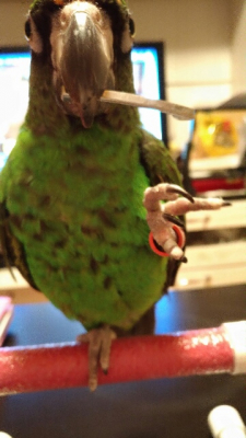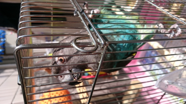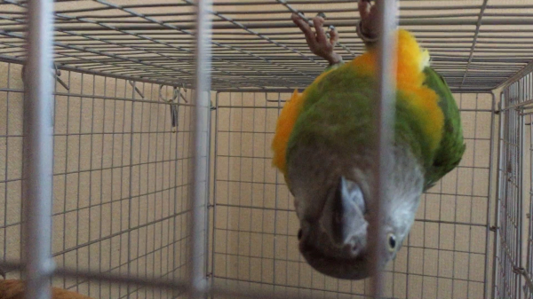 最近は前以上に、天井につけた金具で音をだしたり、チェーンを握ってポールダンスのように(笑)ぐるぐる回るのが楽しいらしく、地鳴きをしたり、歌を歌ったりしながら遊んでいます。