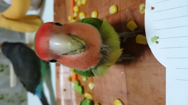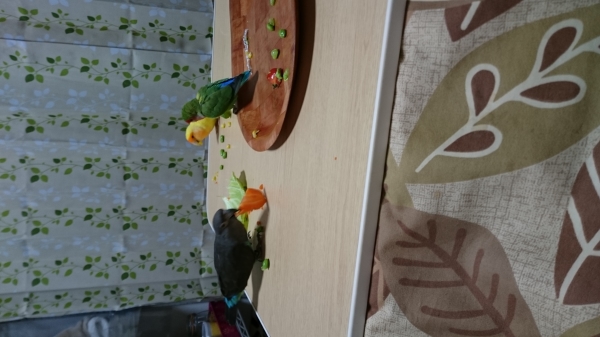 放鳥時トレーに人参やミックスベジタブル等を置いておくと三羽で必死に食べています