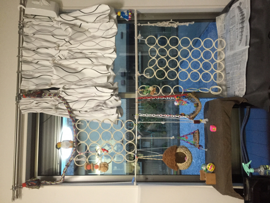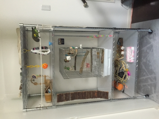 あと、じゅうたんの余りの半分を更に半分にして、2羽のケージにそのまま着けてみました。