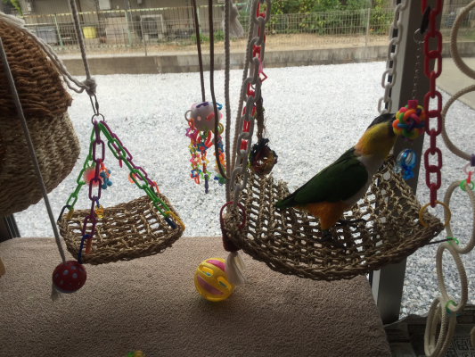 ブランコに憧れていたのに、オカメは全くダメで、ボウシ用にお注文したら、ベニコンゴウ用みたいなのが届きました。