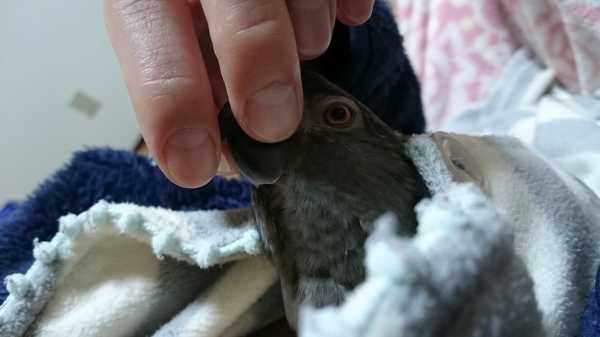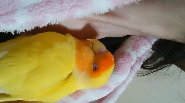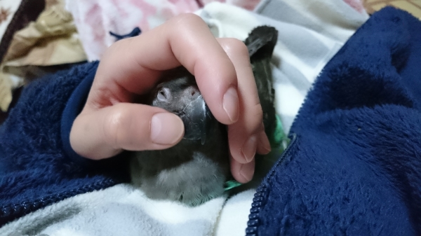 薄明かりにして大丈夫だよ、ここは暖かいよとお気に入りの止まり木に止まらせて撫でること数回