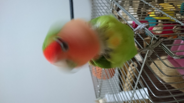 一口、食いついたのですが、直後に悶絶して、くちばしを止まり木に