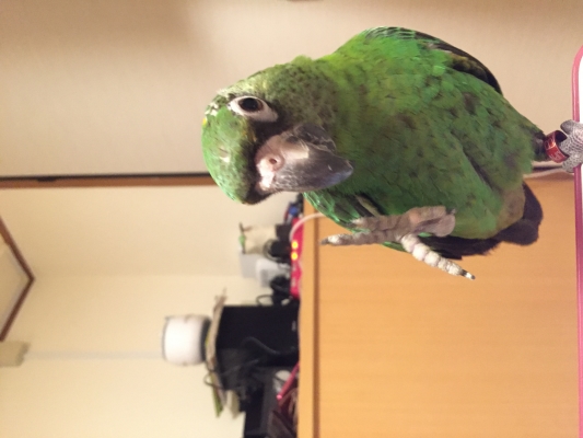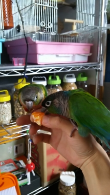 自分の嘴では、皮を剥くことが出来ないので、みかんの上にのって、『食べたい!』と催促する様子はとても可愛らしいです。