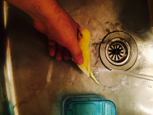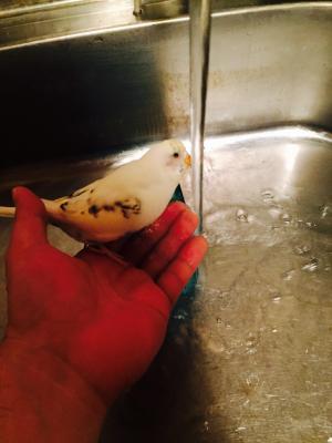 朝の放鳥では、珍しくプリが水浴び。