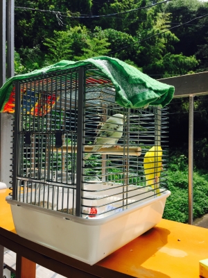 暑さ対策でペットボトルに水を入れ凍らせたのにタオルを巻き、ケージの上に置いてみた。