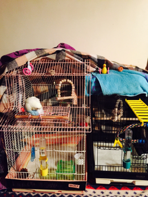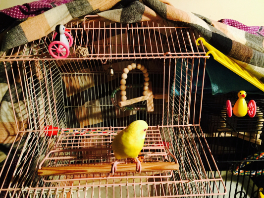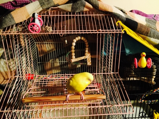 案の定、またぞろぎゃーすか騒ぐので、布をめくってケージ越しに話しかけたりしてみた。