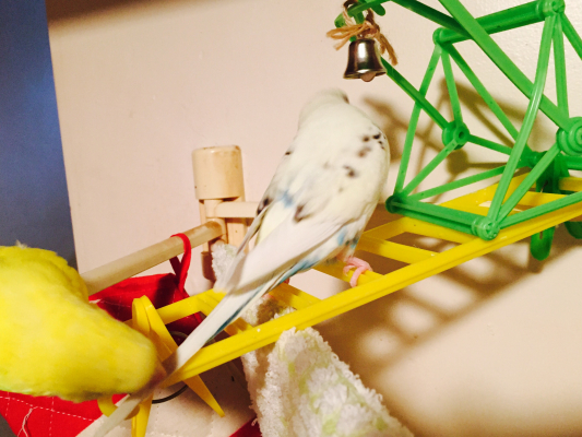 朝の放鳥を終え、ちょっと気分転換と発情対策のために、プリとフクのケージを入れ替えてみたり。