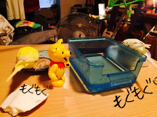 体調に問題がなさそうだったので、環境ストレスを与えるのも良さそうだな、と、ケージの位置を変えてみたところ、楽しみながら、キョロキョロ周りを探索してみてる、といったような割といい感じ。