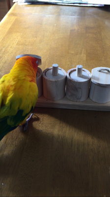 毎日、就寝前にケージの掃除の際にどれくらい食べたかわかるので、それで食事量を見ます。各種シード10〜15g、ヒマワリ20〜30粒、果物2〜3クチバシ分くらい、鳥用オヤツ(ケイティのストロベリーバナナヨーグルト)2〜3個くらい、あとは私の与えるヨーグルト、ご飯粒10粒ほど。