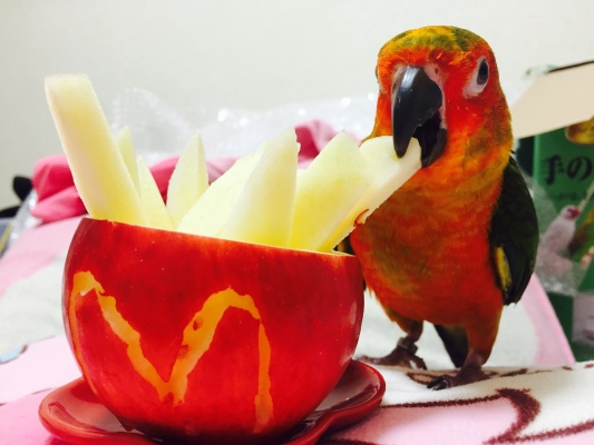 早速「リンゴポテト」?作ったんだねw個人的な疑問として中身どうやってくり抜いているのかな!?と思ったりするんですが、肝心なポテトは別のリンゴで細く切ったの?量多いしw