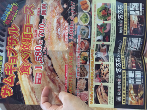 御丁寧にチラシの写真ありがとうございます!!先程夕飯しっかり食べたのですが、写真を見てお腹が鳴りました〜仰せの様に1700円は安いですwたまにガッツリ食べたい時などは有り難いお値段ですよw当たり前ですが、チラシに100分と時間限定が書かれてますね〜えぃさんは何分位お店にいられたのですか!?時間的にも十分足りてるとは思いますがね^^