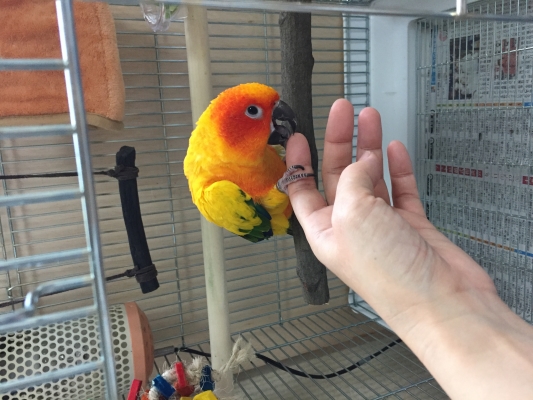1週間経って、「おいで〜」いきなり肩に乗った!!