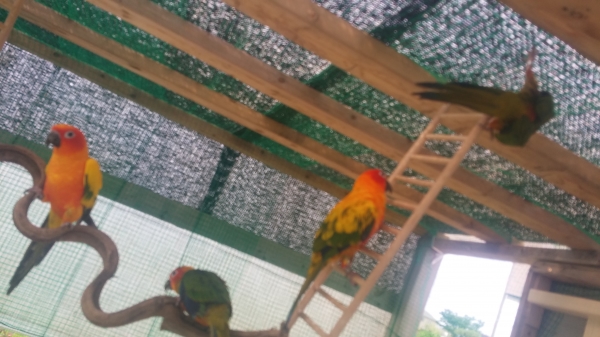 これが噂の放鳥小屋ですね!!頑張って作りましたね〜大きさは6畳位かな!?いつものお部屋と違って4羽は楽しそうに遊んでいますね^^でも4羽が一日中居ないのは分かるんだけど、雨降ったらどうするの!?その度ブルーシート掛けるの??雨で濡れて中が傷んじゃもったいないよ〜。