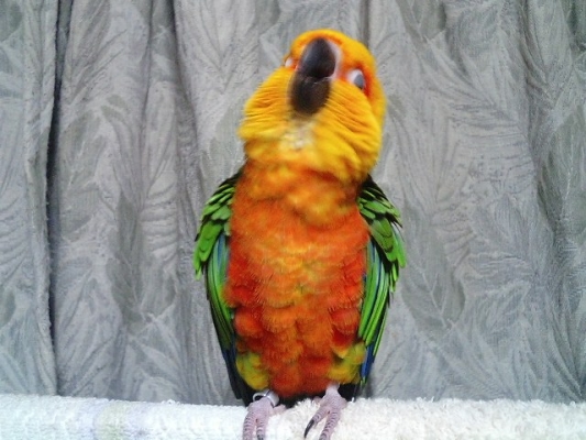 プレゼントのコガネ良く出来てますね(^ν^)確かに目の周りが白くないのと、あと尾羽の色がちょっと違うような〜でも立派にコガネメキシコインコですよねーw
