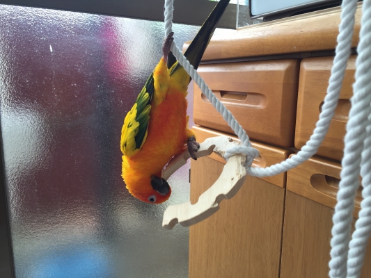 ぱる君本当に楽しそうに遊んでますね!一羽と言う事もあるのか?コガネだからなのか?奈々婦人は余りアクロバティックな遊びは好みません。ナナイロだからか?♀だからなのか?年だからなのか^^きっとビリーもロープが有ればぶら下がるかもw参考までに天井にフックでも付けてロープを下げているんでしょうかね!??w