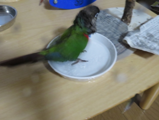 朝から水浴び下インコのせいで、床はびしょびしょ