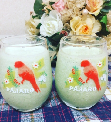 ぺぽままさんに貰ったはるかのジュースと私のお手製のフルーツスムージーを飲んでます^ ^
