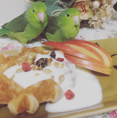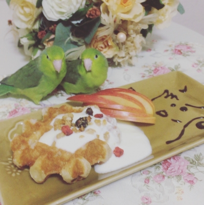 マーチは本当に偉いね〜いつも素敵なモデル鳥wホント絵になります(*^^)v所でリンゴの隣にある美味しそうなお菓子は何ですか!??お腹が空きましたww