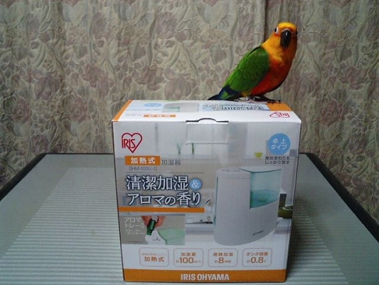 加湿器ですが、私も今年買いましたー!これまでセキセイインコだった為、加湿はあまりしない方が良いかなーと思っていたのですが、ぱるには多少湿度があった方がいいとの事で。私は、価格ドットコムで人気でなおかつ安いアイリスオーヤマの物にしました。(超音波より加熱式の方が衛生的にいいとの事で)もっとお財布に余裕があれば万円の商品が買えたんですけどね〜泣