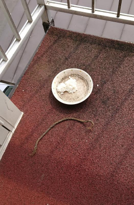おそらく3合分と思われる「めっこ飯」も無くなった今日の朝、野鳥用のお皿の前にちぎれたロープが1本置いてありました。